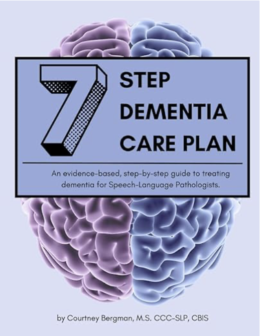 Click HERE to shop the 7 Step Dementia Care Plan! The 7 Step Dementia Care Plan is an evidence-based, step-by-step guide to treating dementia for Speech-Language Pathologists. In this book you will find a guideline for treating dementia, broken down into 7 steps of treatment, including how to assess and provide treatment, seven educational handouts to provide to the patients and their families, and twelve functional therapy activities. The activities included in this workbook are functional, evidence-based, and patient-centered activities that will keep your patients engaged and motivated. While Speech-Language Pathologists cannot reverse the diagnosis, they can help the person with dementia maintain quality of life and independence for as long as possible. This workbook can help new and seasoned clinicians navigate the complexities of dementia treatment with thorough education, evidence-based therapy, and compensatory strategies to better maintain the disease.